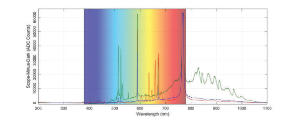 2. 实验系统与方法 图1:烟花测量的实验系统 实验系统见图1。使用的光谱仪为AvaSpec-ULS4096CL-EVO,它配置了4096像素CMOS探测器,USB3.0通信。使用的光源是由烟花样品产生的光,其他附件包括光纤和准直透镜。 实验环境图 实验的烟花样品被点燃后做连续测量,每个样品大约测量500次。 我们将实验样品放置室外测量,需要扣除环境光,所以使用了AvaSoft中的Scope-Minus-Dark(Sd)模式,积分时间设置为5ms,平均设为1。由于本实验测量数据较多,因此通过软件中Live Output功能将数据保存为Excel和ASCII文件,用于进一步的分析和图形绘制。 3. 实验结果与分析 三种烟花样品均在590nm、660nm和770nm处出现显著峰(图2-4)。590nm处的峰为钠元素,用来为烟花添加黄色来增加它们的整体亮度。660nm和770 nm的峰为木炭中的氢和氧元素峰。其中,770nm的峰也可以归因于硝酸钾中的钾元素,它们都是烟花的必要组成成分。 图2:红色烟花样品的光谱 如图2所示,红色烟花样品在约405 nm,460nm,610nm和670nm处出现了小峰。前两个峰405nm和460nm为锶元素峰,锶是一种常见的红色烟花元素添加剂。610nm和670nm的峰为锂元素峰,另一种用于红色着色的元素添加剂。 图3:绿色烟花样品的光谱 如图3所示,绿色烟花样品在500 ~ 550nm以及800 ~ 1000nm出现小峰。其中,553nm处的峰为钡元素峰,钡是烟花中最常用的绿色添加剂。 图4:蓝色烟花样品的光谱 如图4所示,蓝色烟花样品在405nm,435nm, 445nm,515nm和525nm处均出现小峰。405nm峰为铁元素峰,可以增大烟花的火光。435和445nm的峰为钙元素峰,用来加深烟花的颜色。515和525nm为铜元素峰,铜是给烟花添加蓝色的主要元素。令人惊讶的是,这两个峰也出现在绿色烟花样品中,其强度明显高于蓝色烟花样品。 图5:红色烟花(红色线),绿色烟花(绿色线)和蓝色烟花(蓝色线)样品的光谱 所有样品的光谱如图5所示,铜(515nm和525nm,蓝色)和钠(590nm,黄色)对应的元素峰在绿色烟花样品中是最高的,它们结合在一起时可以产生绿色,以此证明绿色烟花样品是由产生蓝色和黄色的火药结合起来制作的。 4. 实验结论 本实验成功地判断了红蓝绿三种颜色烟花样品的部分元素组成,每个元素都有其特定波长的峰。AvaSpec-ULS4096CL-EVO适合高分辨率和高速测量应用,其分辨率(FWHM)可达0.05 nm。