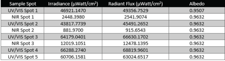 如下显示的是5个雪样品点的反射光谱,辐照度和辐射通量表,并计算了各点的反照率。