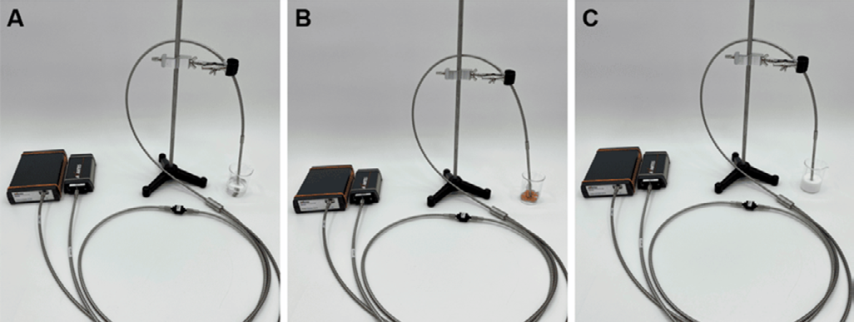 本实验使用的另一个附件为端部为45度窗口的反射探头(可以照亮样品并收集非后向反射信号),一个包含305 nm长通滤光片的支架,以确保只观察到发射光谱。我们将稀释的色氨酸溶液,火鸡肉和全脂牛奶这三个样品分别放置于100ml烧杯中测量。