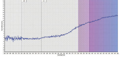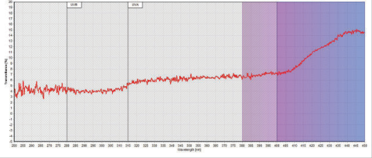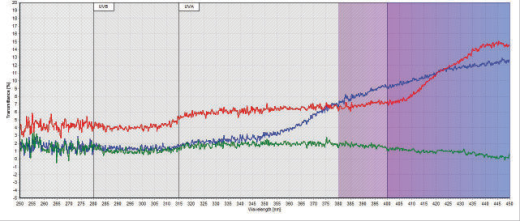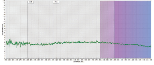 2. 实验目的 图1:本实验所用的服装样品 从左至右:50%棉+50%涤纶服装,100%涤纶服装,100%涤纶防紫外服装 本实验目的是:确定防紫外服装与普通服装的防紫外能力。 实验中,我们将一件涂有防紫外涂层的服装(100%涤纶防紫外服装)暴露在紫外光下,测量布料的另一面,再将所得光谱与独立的紫外光进行比较,以量化服装的防紫外能力。另外,我们还用同样的方法测量了两件服装:一件材料为50%棉+50%涤纶,另一件材料为100%涤纶。 3. 实验仪器 本实验使用了全新迷你光谱仪AvaSpec-NEXOS™,此台光谱仪配置的波长范围为200-450 nm。 使用的光源是AvaLight-XE-HP,一种大功率脉冲氙灯光源。 实验中使用的其他附件包括:一个积分球AvaSphere-50;一个准直镜;一根长度为0.5m,芯径600μm的光纤,用于连接积分球和光谱仪。 图2:实验测量仪器 4. 实验与分析方法 实验方法:实验中的服装样品均为当地商场购买,且没有经过任何制备和清洗处理。我们将使用AvaSoft中的Transmittance透过率模式,以氙灯光源直接照射积分球测量孔而不放置样品作为参考。使用的积分时间为4秒,平均次数为1。 分析方法:日常生活中常见的紫外线分UVB、UVA两种。UVB段波长范围为280-320nm,是户外紫外线波段,人们在室外活动时直接射入皮肤。UVA段波长范围为320-400nm,是令皮肤松弛衰老的因素之一,在医学上将此现象称为光致老化。我们将按照UVB、UVA和剩余波段区域来分析三种样品的防紫外能力。 5. 实验结果与分析 图3:100%涤纶防紫外服装的透过率光谱 图3:正如预期的那样,防紫外服装有出色的紫外线防护能力,UVB区域(280-320nm)的透过率仅为1%左右,UVA区域(320-400nm)的透过率约为2%,剩余波段区域(400-450nm)的透过率不到1%。 图4:50%棉+50%涤纶服装的透过率光谱 图4:50%棉+50%涤纶服装的总体紫外透过率更高,UVB区域(280-320nm)的透过率约为4%,UVA区域(320-400nm)的透过率为6%,剩余波段区域(400-450nm)的透过率约为7%-15%。 图5:100%涤纶服装的透过率光谱 图5:虽然没有添加防紫外线涂层,但100%涤纶服装仍然提供了较强的紫外线防护,尽管只是紫外范围的一部分。UVB区域(280-320nm)的透过率约为1%,UVA区域(320-400nm)的透过率为2-9%,剩余波段区域(400-450nm)的透过率为9-12%。 图6:所有样品的透过率光谱 图6:比较三个样品,很明显,防紫外服装的紫外透过率最低。有趣的是,在UVB区域(280-320nm)和UVA区域(320-400nm)的前端,普通的100%涤纶服装与防紫外的100%涤纶服装防紫外效果几乎一样。这一结果表明,除了服装上额外的防紫外涂层,其材料选择也非常重要。其中,50%棉+50%涤纶服装在所有区域的防紫外线能力都是最弱的。 6. 实验结论 本实验使用了透过率光谱分析法,通过比较三个样品:50%棉+50%涤纶服装,100%涤纶服装,100%涤纶防紫外服装在200-450nm的紫外透过率,确认了防紫外服装的紫外防护能力。 总而言之,在选购防紫外服装时,除了标明具有防紫外线涂层的服装外,服装的材料选择也非常重要。